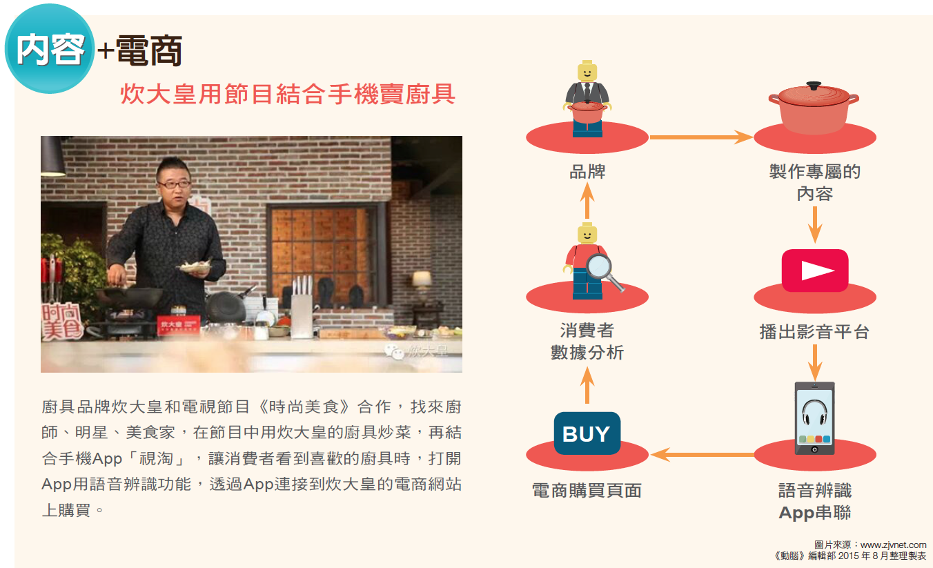 甚至,可以利用手機 App 的串聯,讓電視節目的內容,和電商結合。舉例來說,中國廚具品牌炊大皇和電視節目《時尚美食》合作,找來廚師、明星、美食家,在節目中大顯身手,用炊大皇的廚具炒菜,再結合手機 App「視淘」,讓消費者看到喜歡的廚具時,可以直接打開 App,用語音辨識功能,直接透過 App,連接到炊大皇的電商網站上購買。