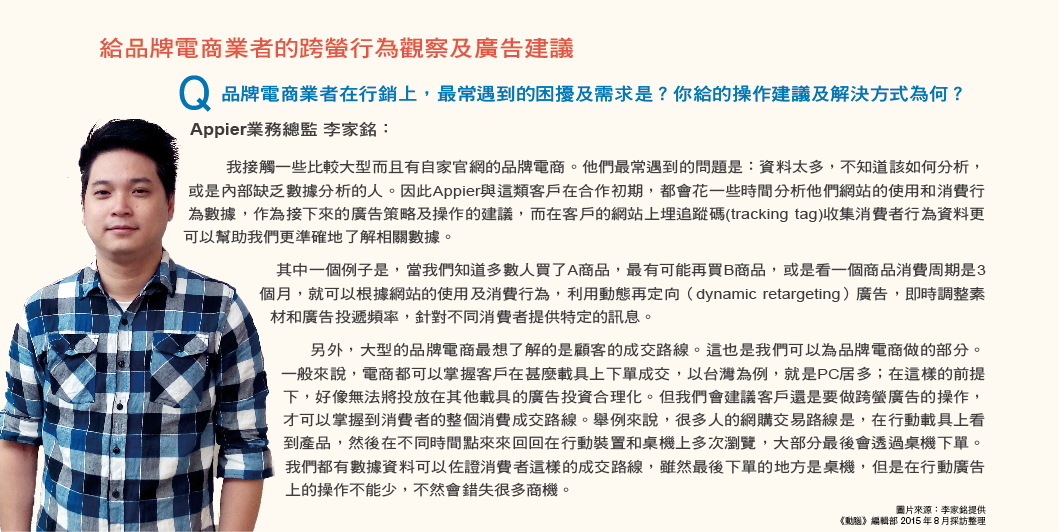 沛星 Appier 曾替品牌電商 OB 嚴選、東京著衣操作過跨螢幕廣告操作,他們利用分析工具,了解顧客在不同螢幕間的行為,及導致最後成交的路線,提供客戶數位廣告策略建議。