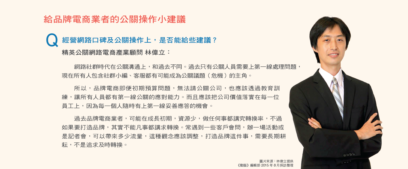 林偉立觀察,電商業者現在最缺乏的是說故事的能力,及凸顯品牌的獨特性。他建議電商業者不要擔心自己沒有故事,相信每個人在創業的過程中,都會有一些小堅持,或是服務的特色,可以試著在不同的情境講述出來。