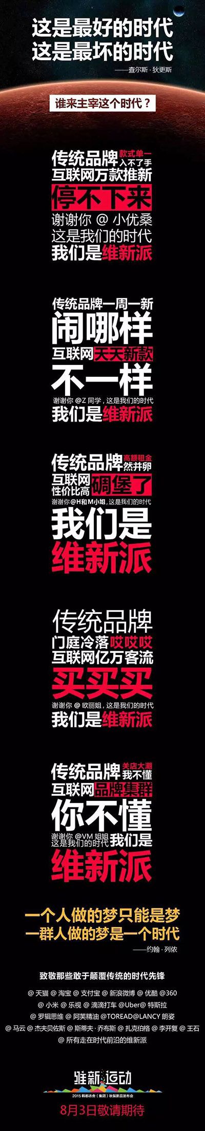 針對 Uniqlo 的寫著:「傳統品牌款式單一入不了手,互聯網萬款推新停不下來,謝謝你 @小優桑(指優衣庫 Uniqlo),這是我們的時代,我們是維新派。」最後還加上「一個人做的夢可能只是夢,一群人做的夢是一個時代」,向所有敢於顛覆傳統行業的人致敬,名單包括小米、淘寶、樂視、滴滴打車等。並且埋下伏筆,請大家期待8月3日,這場「維新運動」還有後續。
