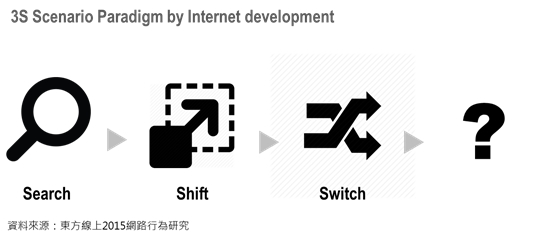 東方線上透過跨年度的全台消費者入戶訪問調查中,發現台灣消費者對於網路的使用目的可以分為三個階段,分別為Search (搜尋)、Shift (轉移)、Switch (交換):