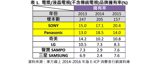 根據東方線上2014-2016年版E-ICP消費者行銷資料庫數據,台灣液晶電視市場主力業者有奇美、聲寶、大同、東元等,韓系品牌以LG、三星為主力;日系則以SONY、Panasonic、SHARP為主。