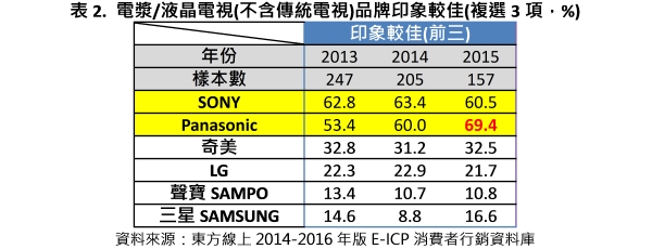 另外,從表1與表2可以發現一個有趣的現象,Panasonic在品牌好感度上領先眾品牌,但在品牌擁有率上卻低於SONY、位居第二!究竟為什麼Panasonic無法順利將好感度移轉到擁有率,是本篇想要探討的重點。