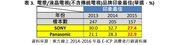 好感度若只能擇一(如表3):Panasonic退居到第二, 顯示儘管Panasonic於2015年印象較佳排名成長到第一,但仍未撼動到受訪者心中電視最佳選擇的品牌,仍距第一名SONY近5個百分比。