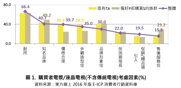 以購買電視的考慮因素來看,如圖1,整體注重耐用(66.4%)、知名品牌(40.7%)、價格合理(39.7%)為主,偏向理性考量;若進一步細看二族群差異,相較於Panasonice既有TA, 偏好P卻購買S的族群對知名品牌(49.2%)、售後服務(29.2%)等更為重視,價格、外觀相比下反而不是重點。