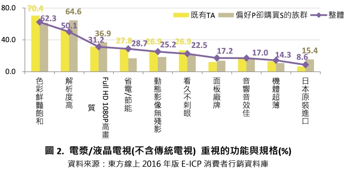 若以功能、規格方面來思考 (如圖2),整體以色彩鮮豔飽和(62.3%)、解析度高(50.1%)、Full HD 1080P高畫質(31.2%)為主。而比對二群人,Panasonic既有TA於色彩鮮豔飽和(70.4%)、省電/節能(27.8%)、動態影像無殘影(26.9%)、看久不會刺眼(26.9%)等比例較為突出。