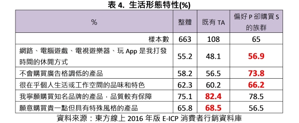 從生活態度中也可發現 (如表4),Panasonic既有TA追求知名品牌,甚至對環保更是重視,因此對「家電第一品牌」的Panasonic具高接受度,而 偏好P卻購買S的族群偏向品味質感的追求,且對科技產品的休閒活動比例相對突出。