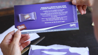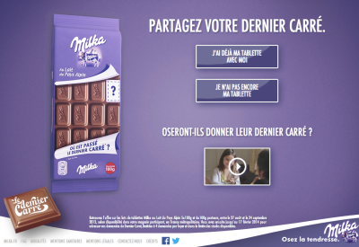 (Brain.com 2013-09-03)為了讓Slogan「dare to be tender」,不只是流於說說而已,而是一個真的能幫助消費者實現的感受。「Milka巧克力」在法國辦了一個「Last Square」活動,生產了1,000萬片,看似有瑕疵的巧克力。Milka塊狀巧克力,正常版是一大塊切割成20小塊,當你需要食用時再一塊塊地掰開來吃。這個新版本,則是一樣的價錢,卻只給你19小塊!少掉的那一小塊,不是生產上的瑕疵,也不是被偷吃了,而是為了完成「最後一塊巧克力,只留給妳最在意的人」的實體體驗關鍵。