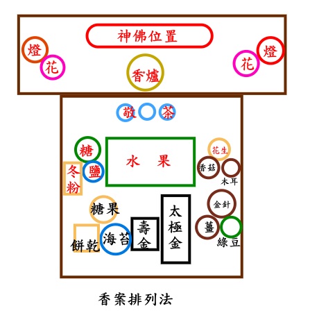 地點:家中佛堂神明桌上, 如無供奉神佛可用紅紙(高2尺九寸寬1尺四寸)