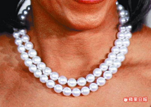 蜜雪兒前天晚宴穿著黑白無袖禮服(左圖),搭配台灣品牌的珍珠項鍊(右圖)。