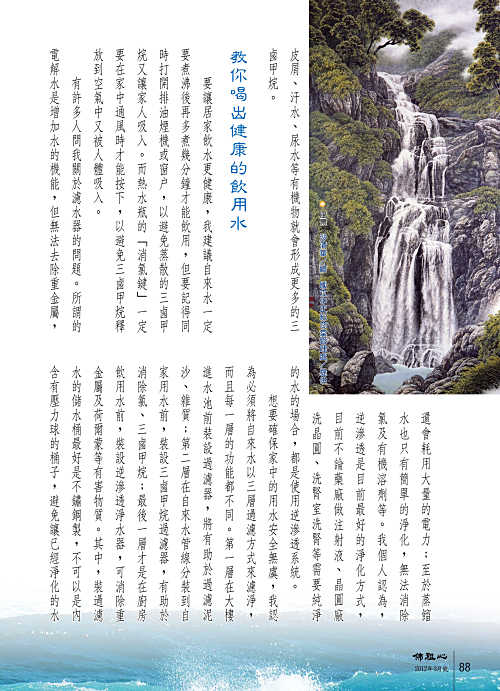 有許多人問我關於濾水器的問題。所謂的電解水是增加水的機能,但無法去除重金屬,還會耗用大量的電力;至於蒸餾水也只有簡單的淨化,無法消除氯及有機溶劑等。我個人認為,逆滲透是目前最好的淨化方式,目前不論藥廠做注射液、晶圓廠洗晶圓、洗腎室洗腎等需要純淨的水的場合,都是使用逆滲透系統。