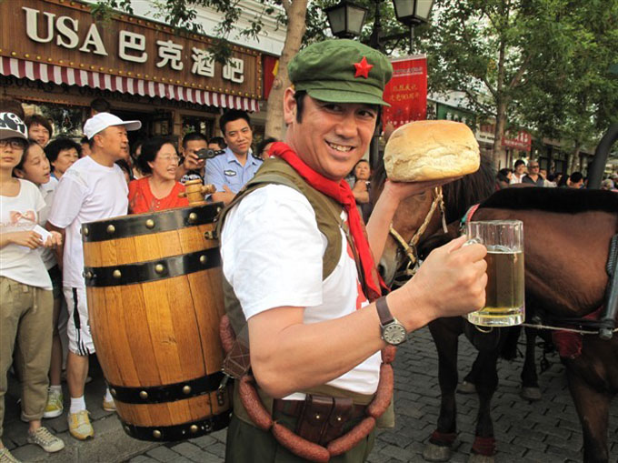 甲哥收藏了世界各國的2萬余張啤酒商標,其數量之多、品種之全,位居世界前五。哈爾濱每年的啤酒節,身為“啤酒先生”的甲哥不僅將自己收藏的部分酒標拿到中央大街上進行展示,還會帶著俄羅斯小鎮的啤酒車隊、騎著兩輪賽格威小車在中央大街上巡遊,然後端著紮啤在會場裡挨桌敬酒,充分履行了哈爾濱人“喝啤酒像灌溉”的城市豪情,成為啤酒節期間,中央大街上一道亮麗的風景線。
