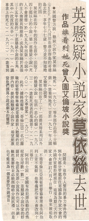 這是一篇刊登於2000年8月上旬世界日報美洲版的一則新聞剪報,這則新聞有一些與事實不符,首先,莫伊絲本人的作品屬於傳統解謎小說,而非文中所稱懸疑小說(Suspense),其次,這則新聞稿把她短篇作品也當做小說看待,所以才會有四十部以上小說的說法
