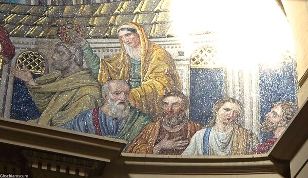 我拍的幾張照片,在畫面右邊都有大片的白色,這是光線透過窗戶照進室內,被馬賽克玻璃崁片反射形成一片耀眼光芒。馬賽克鑲崁畫與一般繪畫有著很大的不同,它的色彩是光線與玻璃或光滑石塊互相作用呈現出來的。在不同光線、不同角度下,畫面都會產生微妙的光影流動,這是照片表現不出來的。例如,整幅畫中色彩最顯眼的是基督頭頂的光環,在現場觀看,它散發著熠熠生輝的金色光芒,很難用照片拍出如此光彩奪目的景象。