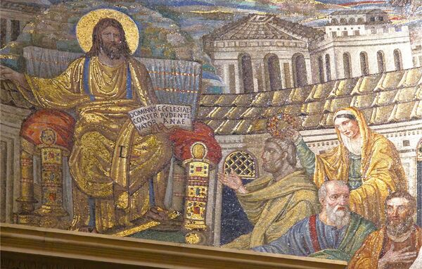 馬賽克畫的主題為耶穌與十二門徒。耶穌身穿羅馬式長袍(toga),居中坐在鑲滿寶石的寶座上。十二門徒一字排開,對稱的坐在寶座兩側。左邊最靠近耶穌的是聖伯多祿,右邊是聖保祿。在伯多祿與保祿身後各有一位拿著花環的少女。耶穌身後有一道迴廊橫過整個畫面,將前方人物與背景隔開。耶穌頭頂上是鑲有寶石的十字架,十字架立在ㄧ座小山丘上,那是耶穌受難的骷髏地。背景的建築群代表代表聖地耶路撒冷。藍天中佈滿黃橙色交織的雲霧,代表福音書作者的四活物(人、獅、牛、鷹)浮現在雲層中,預示基督乘著雲彩再次降臨,進行最後的審判。