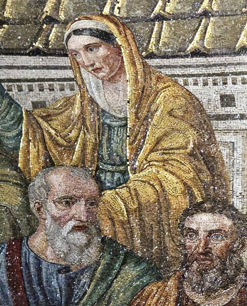 ▼基督右手邊坐六位著身著白色羅馬式長袍的門徒,正在聽取基督的訓示。後方站著最一位手拿花冠的女性,為聖伯多祿加冕。這位女性代表聖普正珍或是異教徒化身的新約教會。十六世紀教堂整修時,這幅畫被局部切除,現在只剩五位門徒。