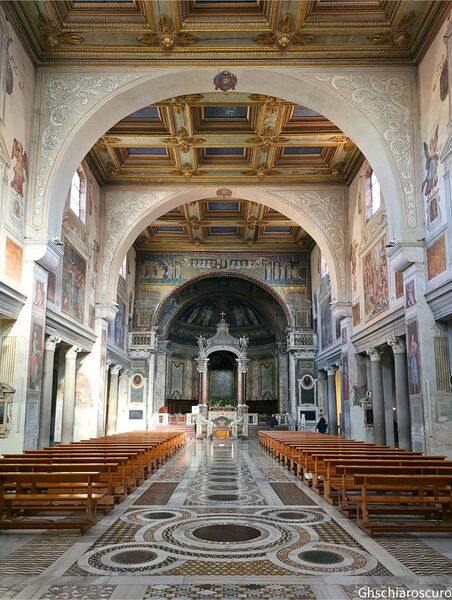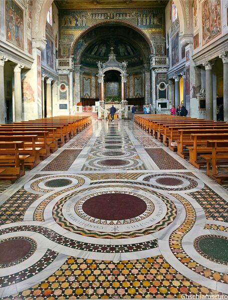 教堂地板是在20世紀初整修時重新鋪設的,忠實復古呈現西元12到13世紀盛行於羅馬的Cosmatesque裝飾藝術。這種以單純的三角形、正方形、圓形、菱形等各色石材崁入大理石板基底組成的大理石拼貼裝飾,以連續、重複、連鎖等構圖展現出理性美感的幾何圖案。