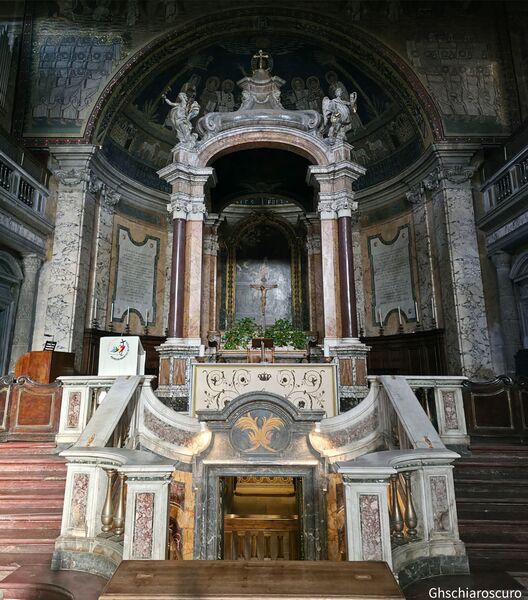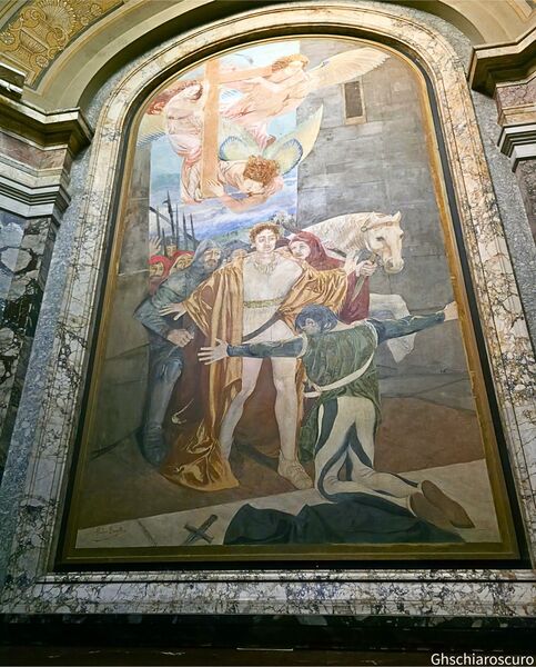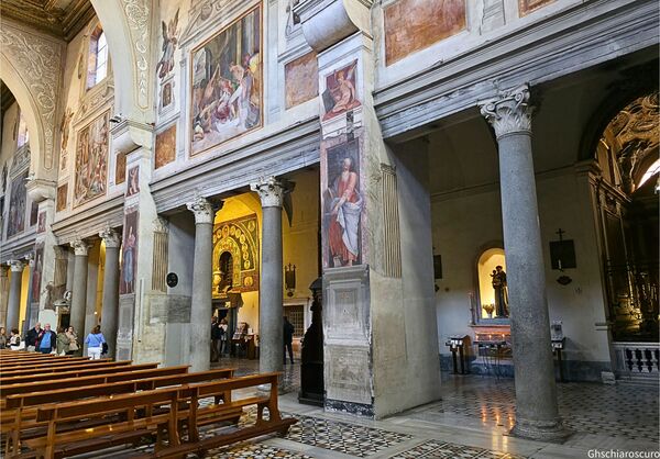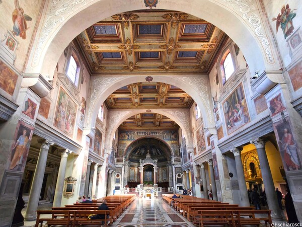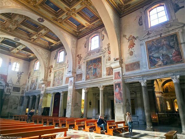 ▼中殿兩側牆上的壁畫是來自佛羅倫斯梅迪奇家族的樞機主教Cardina Alessandro deMedici出資贊助的,創作於西元1594-1596年間,以耶穌受難故事為題材。梅迪奇樞機主教於1592-1594年擔任本教堂的領銜樞機,後來於1605年成為教宗良十一世(Leo XI),但僅在位26天即過世。