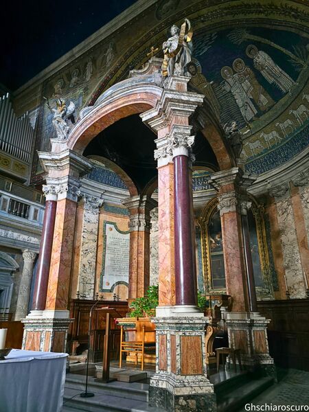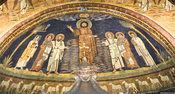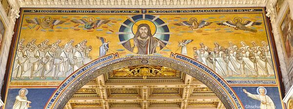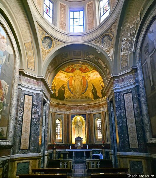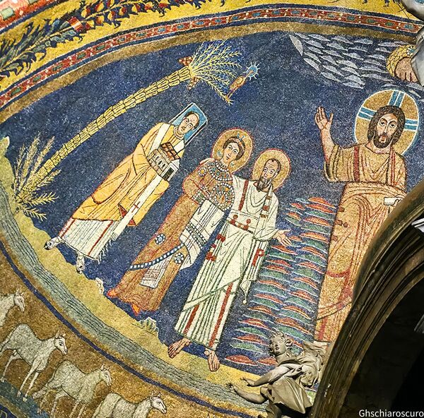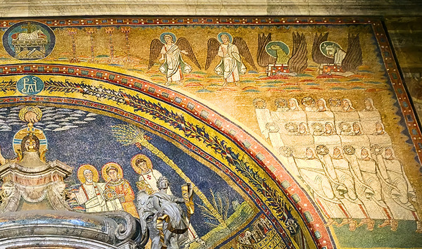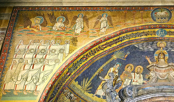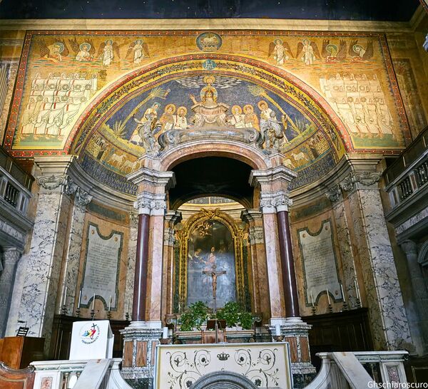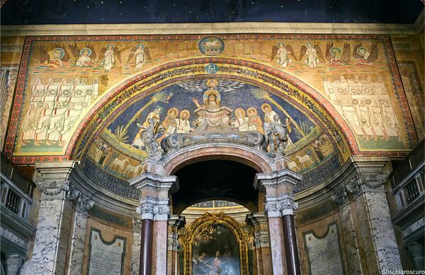 ▼凱旋門拱、半圓形後殿拱以及後殿半圓穹頂上色彩鮮艷奪目的九世紀馬賽克鑲崁畫是羅馬教堂中最為純正的拜占庭風格藝術創作。