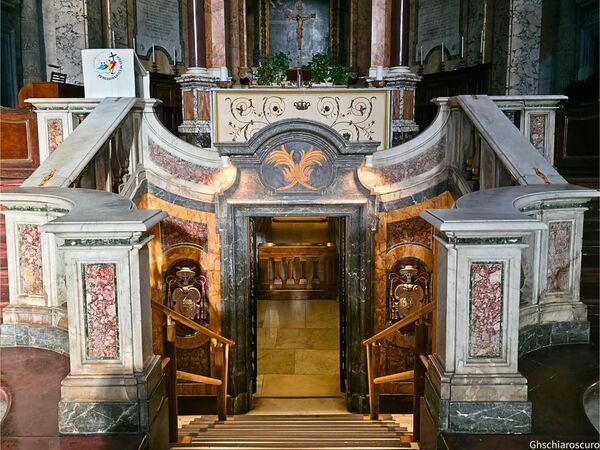 ▼聖巴西德大殿是羅馬255座領銜教堂之一,側門兩側懸掛著教宗與領銜司鐸的牧徽。大門左側仍懸掛著今年(2025)去世的教宗方濟各牧徽。