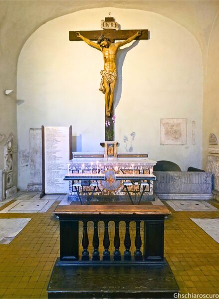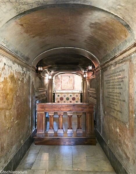 ▼地下墓室是一個狹長的通道,似乎是模仿古羅馬時代的地下墓穴。盡頭有一個以Cosmatesque裝飾的祭壇。祭壇左右兩側各有兩個上下堆疊的古羅馬石棺,其中一個安置聖普正珍與聖巴西德的遺骸,另外三個裝有教宗巴斯加一世從羅馬城外各地下墓室收集來的殉道者遺骸。
