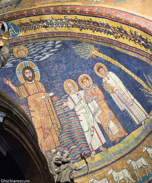 ▼左側壁龕的四位人物由右至左依序為聖聖普正珍、聖母瑪利亞、聖巴西德、教宗巴斯加一世的母親。教宗的母親頭頂四方形光環,代表在製作這幅馬賽克畫時依然在世。