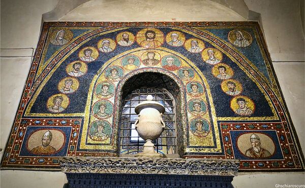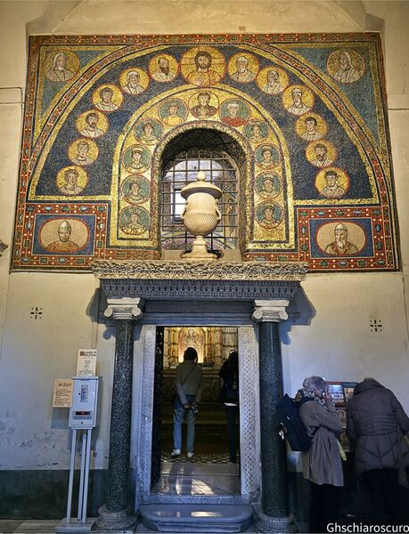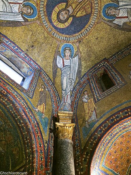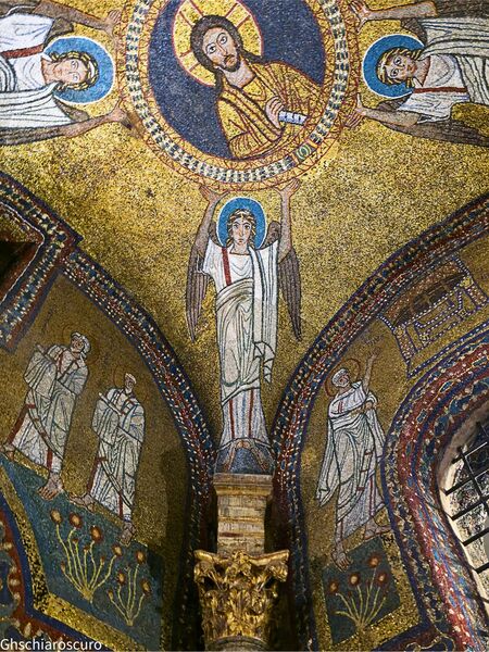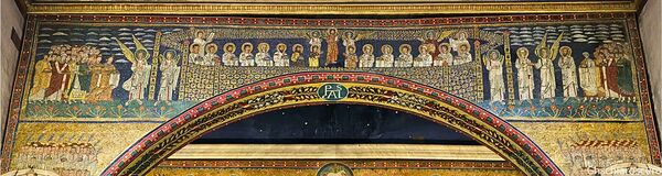 後殿拱馬賽克畫描繪啟示錄中的末日異象,畫面中央寶座上坐著代表耶穌的羔羊,寶座下是象徵末日災難與審判的七密封書卷。兩側是代表神之七靈的七盞火燈以及四福音書作者人、獅、牛、鷹四活物。左右側下方是代表舊約12支派與新約12使徒的24位穿著白袍的長老,手持呈獻給羔羊的金冠及花圈。