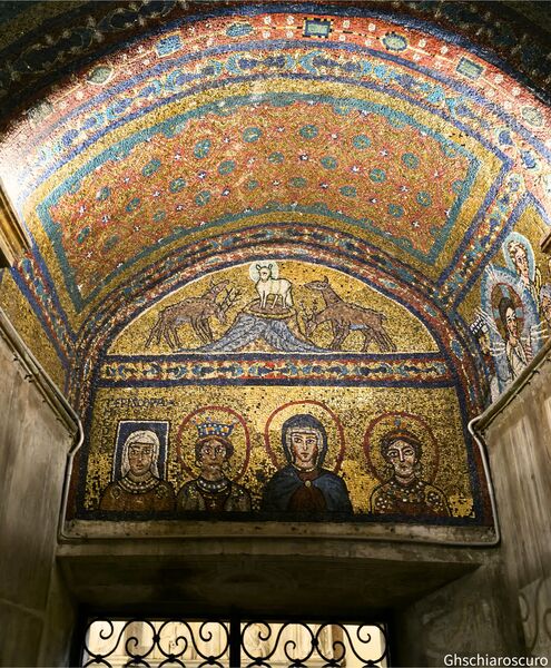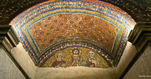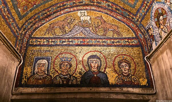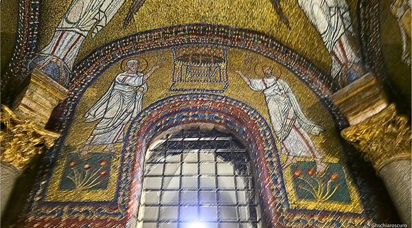 ▼左側壁龕聖人像上方半圓形牆面描繪天主羔羊站在山丘上,俯瞰從腳下流出的四條樂園之河(the Rivers of Paradise),象徵基督的勝利。壁龕上方拱圈內側也鋪滿了色彩鮮艷的馬賽克幾何圖形。