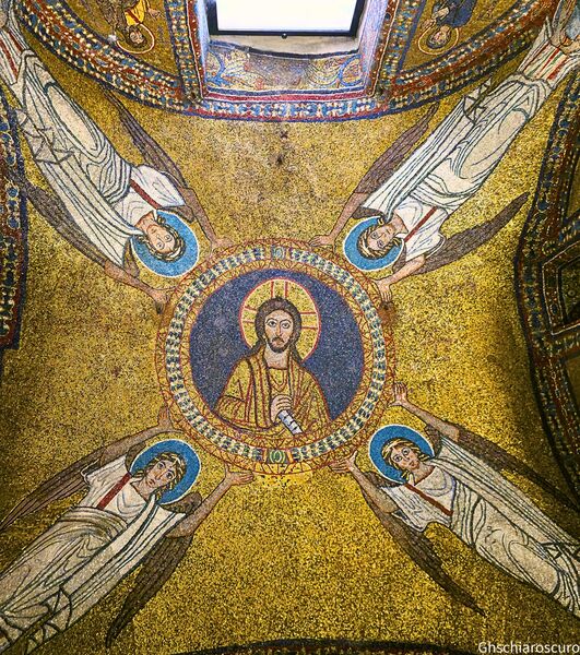 ▼禮拜堂上方交叉拱頂的馬賽克鑲崁畫是四位天使雙手高舉,榮耀「基督全能者」(Christ Pantocartor)的圖像。