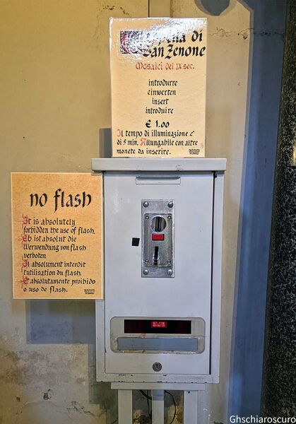 ▼聖芝諾禮拜堂入口以兩根古羅馬時代的愛奧尼亞柱與柱頂楣構作為裝飾。柱頂楣構上安置一座古羅馬時代的水瓶。牆面上半部有一大幅的馬賽克畫以及一個圓頭窗。