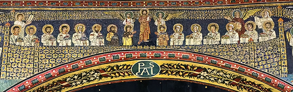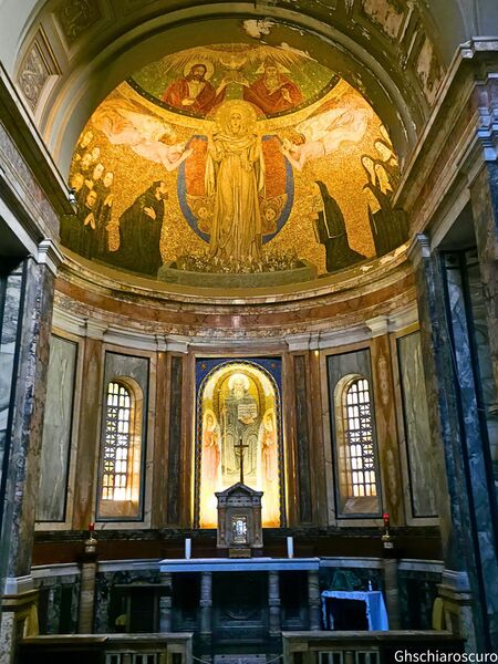 ▼圓頭窗外圍有一圈金色為底的馬賽克畫,最上面是聖母子像,兩側由上到下排列著十位女性殉道聖人。再外一圈以深藍色為底,最上方是耶穌像,十二使徒在兩側依序排列。畫面最下方左右角落是教宗巴斯加一世與後繼教宗Eugene II,這是19世紀添加上去的。金色為底的內環搭配綠底的人像圓盤;藍色底的外環配上金色圓盤,色彩燦爛,對比鮮明。