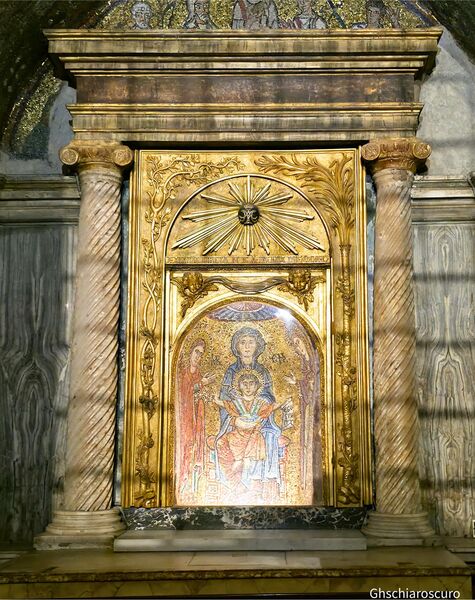 教宗手捧教堂模型獻給耶穌的宗教圖像最早出現在西元六世紀的聖葛斯默與聖達彌盎大殿(Basilca dei Santi Cosma e Damiano)後殿半圓穹頂馬賽克畫中,這開創了教宗作為建造教堂贊助者出現在聖像畫中的傳統。延續此項傳統的就是教宗巴斯加一世,在他七年任期內建造了三座教堂,也將他自己的形象畫在教堂的後殿馬賽克鑲崁畫中。