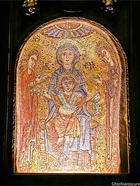 ▼分隔中殿及至聖所的凱旋門拱之馬賽克鑲崁畫