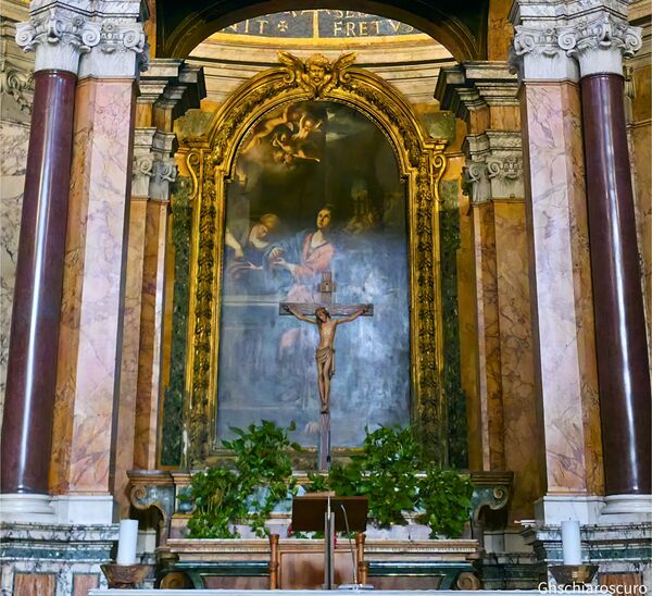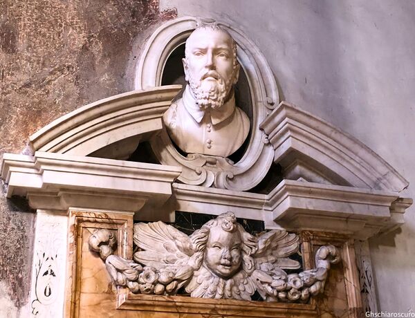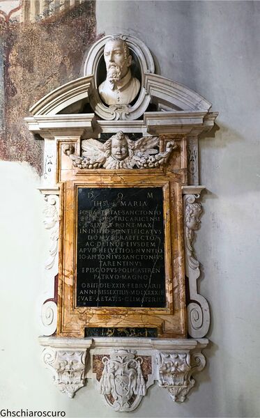 ▼中殿右側最靠近祭壇的方柱上是主教Giovanni Battista Santoni的紀念碑,他曾擔任過教宗西篤五世(1585-1590)的大總管。這座半身胸像是巴洛克大師貝里尼的非常早期的作品,創作年代大約在1613-1616年間,此時貝里尼還是個十六歲左右的青少年。這件作品呈現出矯飾主義到早期巴洛克時期的藝術風格。