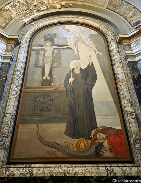 ▼禮拜堂祭壇畫與半圓拱頂畫都是新藝術風格的馬賽克鑲崁畫。祭壇畫主題是榮耀San Giovanni Gaulberto。半圓拱頂畫則是Vallumbrosan隱修會之僧侶與修女榮耀聖母升天。