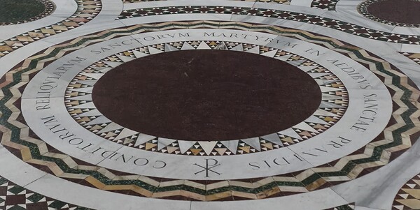 ▼中殿地板有一塊圓盤狀的紫色斑岩,外面的一圈拉丁文寫著:「位於聖西德大殿內的聖殉道者遺骸安放處」。這下方有一口井,相傳聖巴西德將收集來的殉道者的血液放置於此井內。