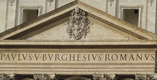 ▼梵諦岡聖伯多祿大殿立面正中央之銘文: 保祿五世 博格賽 羅馬人