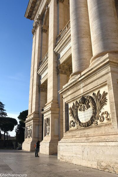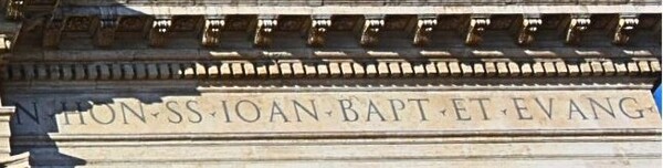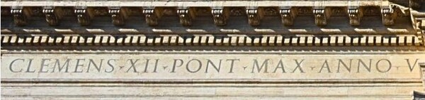 ▼教堂正立面橫飾帶上雋刻著拉丁銘文: CLEMENS XII PONT MAX ANNO V CHRISTO SALVATORI IN HON SS LOAN BAPT ET EVANG MDCCXXXV