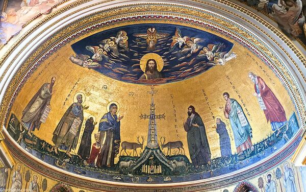 馬賽克壁畫內容大致說明如下,畫作上方的救世主從雲層中顯現,四週伴隨著天使,高高在上的耶穌展現出世界的主宰。基督下方是一座鑲滿寶石的十字架,十字架豎立在山丘上,山丘上站著兩隻羔羊。四道水流從山頂流出,並匯流到畫面下緣的約旦河。這四道水流代表四福音書,如同流水傳到世界各地。