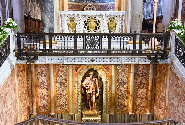 聖若望大殿祭壇華蓋就像一座層次分明的哥德式尖塔,整體結構分為四層: 第一層由四根大理石柱支撐整座華蓋,祭壇位於第一層內部。第二層是柱頂的簷部,像個方框,每面都有三幅濕壁畫。第三層是以柵欄圍起來的空間,裡面放置珍貴的聖髑。最上面是頂棚。