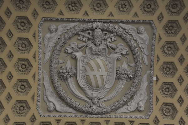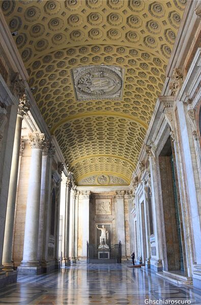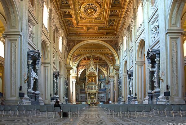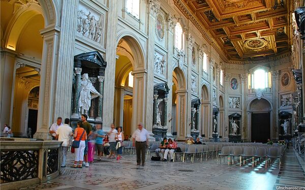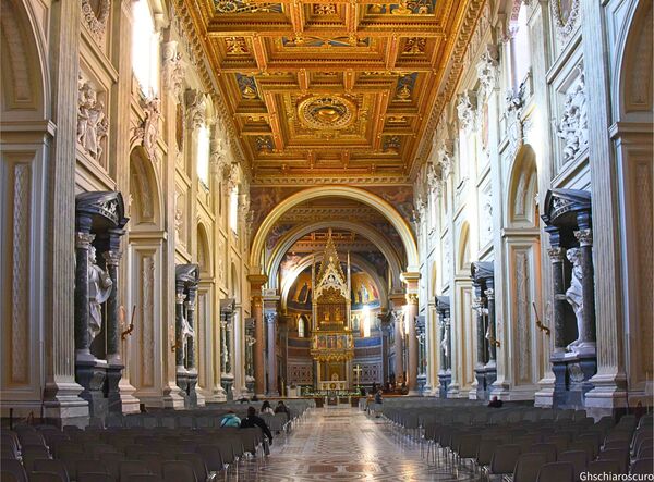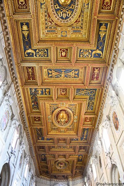 ▼中殿金碧輝煌的文藝復興風格平頂格狀天花板是教宗庇護四世(Pius IV, 1559-1565在位)委託義大利建築師設計,法國籍木匠Flaminio Bolongier 製作。工程於庇護五世(Pius V, 1566-1572在位)時完工。之後庇護六世(Pius VI, 1775-1799在位)時加以修護與補強。三位庇護教宗的牧徽都裝飾在天花板上。
