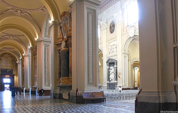 ▼中殿右側第二個墩柱的背側是教宗思維二世(Sylvester II, 999-1003在位)紀念碑。思維二世是第一個法國籍教宗,是具有傳奇色彩的「千禧年教宗」。他曾去當時仍為阿拉伯人統治的西班牙學習,接觸到先進的阿拉伯文明而精通天文與數學,並將阿拉伯數字引進歐洲。