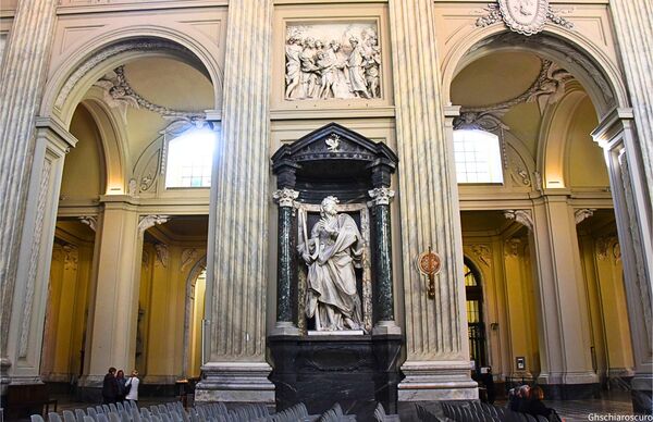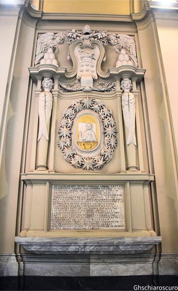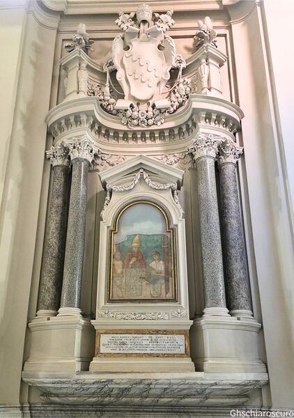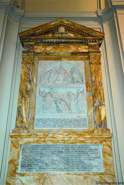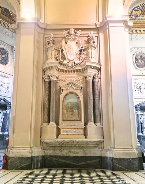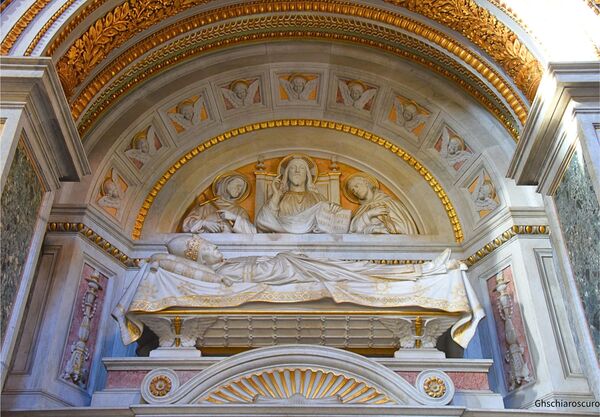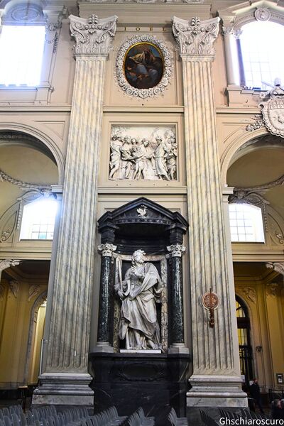 ▼中殿右側第四個墩柱的背側是教宗色爾爵四世(Sergius IV, 1009-1012在位)陵墓。教宗原本的墓在十四世紀教堂火災中燒毀,後來將殘骸收集起來葬於此,這紀念碑也是波洛米尼設計的。