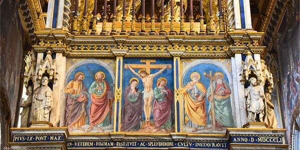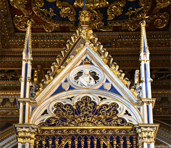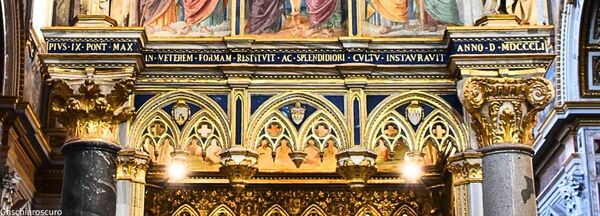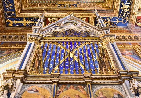 ▼第一層柱子之間以三連拱相接,每一個拱內部有兩個尖拱,尖拱內又有兩個三葉拱(trefoil arch)。就像俄羅斯娃娃,一層套著一層,裝飾的非常繁複。宗庇護九世(Pius IX)在1851對祭壇華蓋進行整修,在正面柱子上方以一排銘文紀念此此次維修: 「教宗庇護九世 將其恢復原貌 並以更華麗的風格重新修繕 主後1851年」。