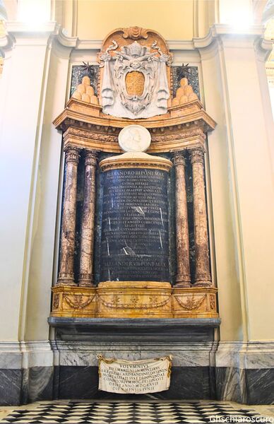 ▼中殿右側第三個墩柱的背側是教宗亞歷山大三世(Alexander III, 1159-1181在位)陵墓。這座墓是由波洛米尼設計。亞歷山大三世是中世紀極具影響力的教宗,在位長達22年。在他任內與綽號紅鬍子巴巴羅薩的神聖羅馬帝國皇帝腓特烈一世進行了長達20年的權力鬥爭,最後教宗支持倫巴底同盟對抗皇帝而獲勝。教宗在1179年第三次拉特朗公議會確立教宗選舉制度,規定教宗候選人必須獲得三分之二以上樞機主教的投票才能當選,此制度一直沿用至今。