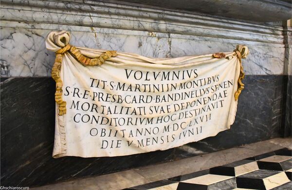 ▼教宗亞歷山大三世紀念碑下方有一塊掛毯,上面的文字是紀念一位十七世紀的樞機主教,他是教宗亞歷山大三世的後裔。這塊掛毯遠距離看真的就像一塊布,但其實是用大理石雕刻出來的,我用手去觸摸,表面非常滑順,製作的逼真傳神。
