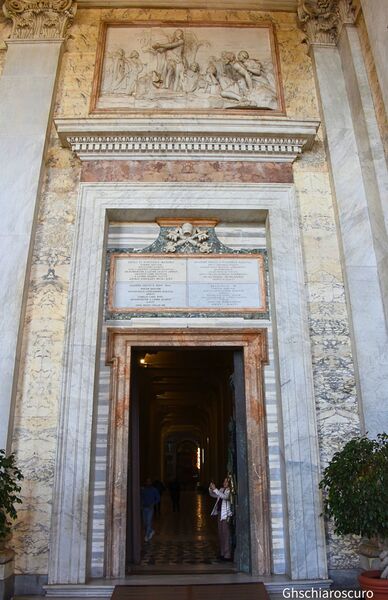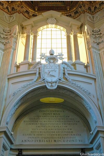 「教宗克萊孟十二世,在位第五年,將此大殿獻給基督救世主,並紀念施洗者聖若望與傳福音者聖若望,1735年」
