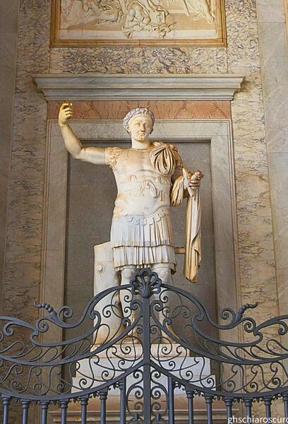 ▼門廊左側展示著羅馬君士坦丁皇帝的大理石雕像。這尊雕像是在戴克里先浴場遺址往掘出來的古羅馬時代雕像,教宗克萊孟十二世下令移來此處陳列。