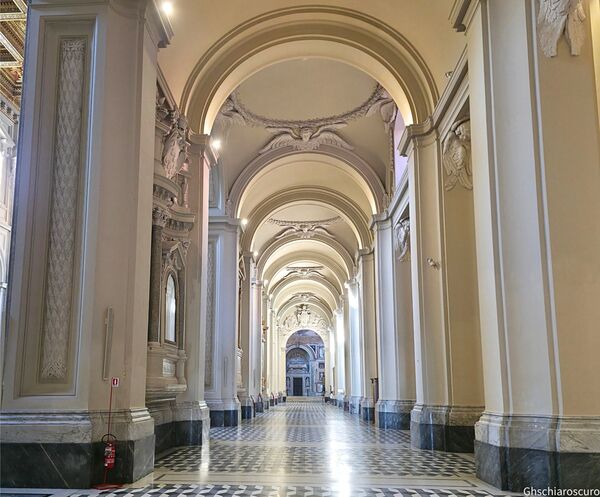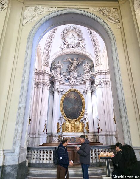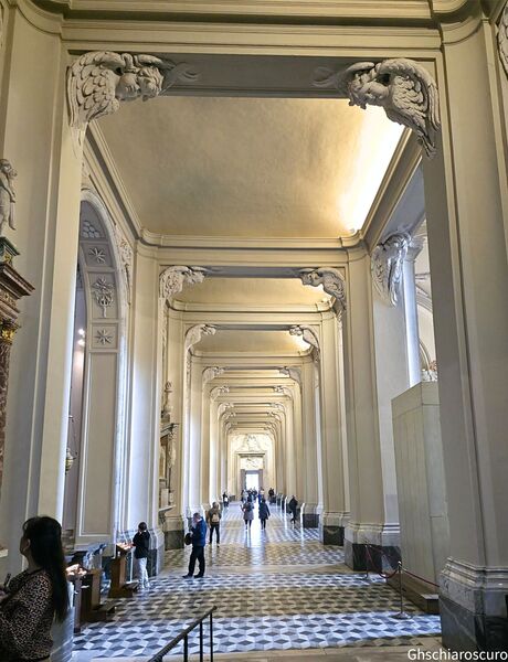▼再看一次聖若望大殿的中殿,金碧輝煌的文藝術興風格天花板與波洛米尼設計的巴洛克風格純白色墩柱呈現出強烈的對比。