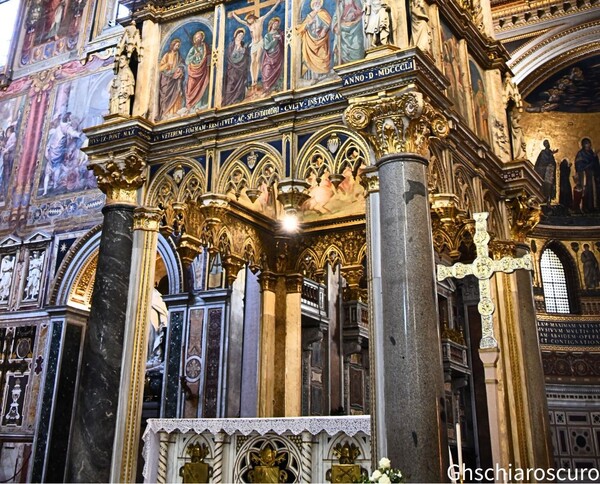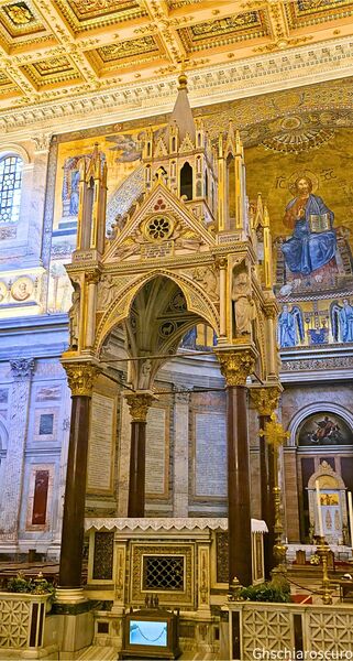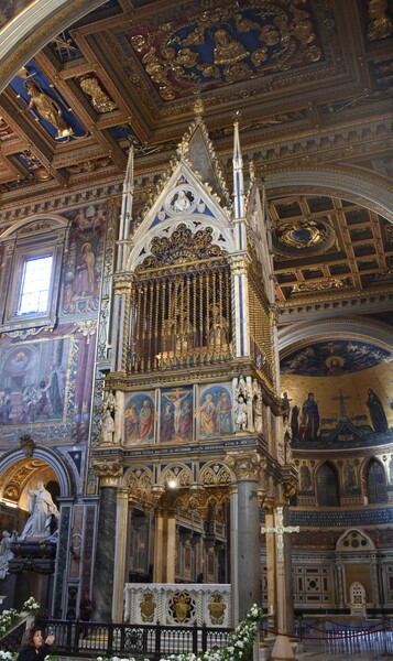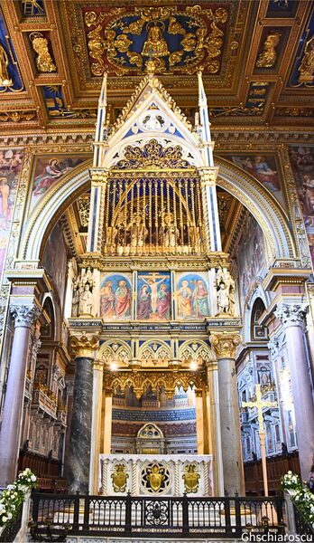 ▼這是牆外聖保祿大殿祭壇華蓋,是羅馬最早的中世紀哥德風格華蓋,結構比聖若望大殿華蓋簡單許多。與一般的中世紀祭壇華蓋相比,聖若望大殿祭壇華蓋多了一層壁畫以及保存聖髑的空間,結構相對複雜許多,高度也較高。